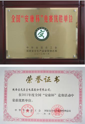 我公司榮獲2011年度全國(guó)“安康杯”競(jìng)賽優(yōu)勝單位稱號(hào)。全國(guó)“安康杯”競(jìng)賽活動(dòng)是全國(guó)總工會(huì)、國(guó)家安全生產(chǎn)監(jiān)督管理總局聯(lián)合開(kāi)展的全國(guó)工業(yè)企業(yè)安全生產(chǎn)與職業(yè)衛(wèi)生健康活動(dòng)。自1999年開(kāi)展以來(lái),我公司已于2001年、2007年、2011年三次榮獲全國(guó)“安康杯”競(jìng)賽活動(dòng)優(yōu)勝單位殊榮。