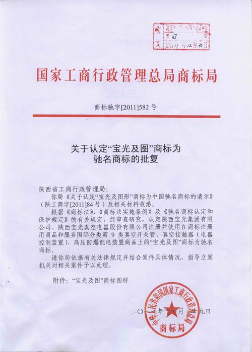 被中華人民共和國國家工商行政管理總局商標(biāo)局認(rèn)定為“中國馳名商標(biāo)”,于2011年11月29日正式下發(fā)了《關(guān)于認(rèn)定“寶光及圖”商標(biāo)為馳名商標(biāo)的批復(fù)》(商標(biāo)馳字【2011】582號(hào))文件)。