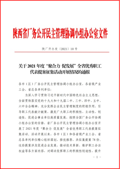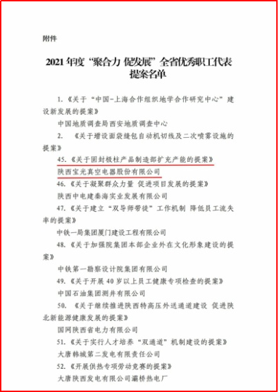 近日,從陜西省總工會傳來喜訊,寶光集團《關于固封極柱產品制造部擴充產能的提案》榮獲陜西省2021年度“聚合力 促發(fā)展”全省優(yōu)秀職工代表提案。
