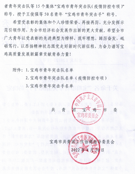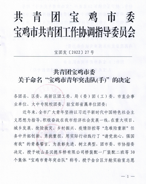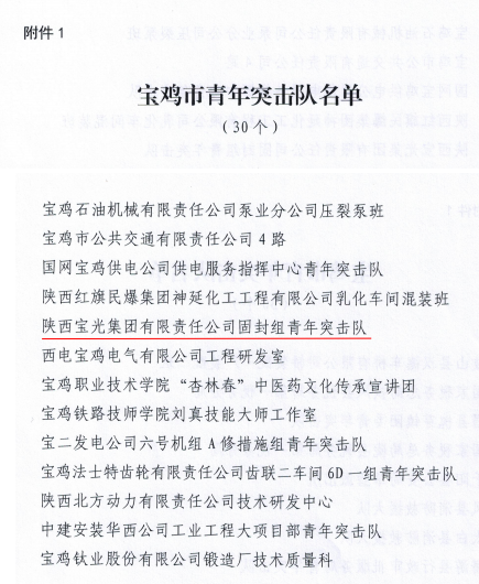 近日,從團(tuán)市委獲悉,寶光股份固封班組被授予“寶雞市青年突擊隊(duì)”榮譽(yù)稱號。