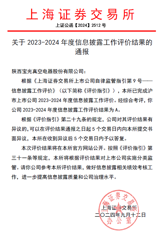日前,上海證券交易所(以下簡(jiǎn)稱上交所)發(fā)布了《滬市上市公司20232024年度信息披露工作評(píng)價(jià)結(jié)果》,寶光股份(600379)榮獲信息披露工作最高考核評(píng)級(jí)A級(jí),這是公司首次獲此榮譽(yù),是上交所對(duì)寶光股份信息披露、公司治理、投資者關(guān)系管理、履行社會(huì)責(zé)任等方面的高度認(rèn)可和肯定。