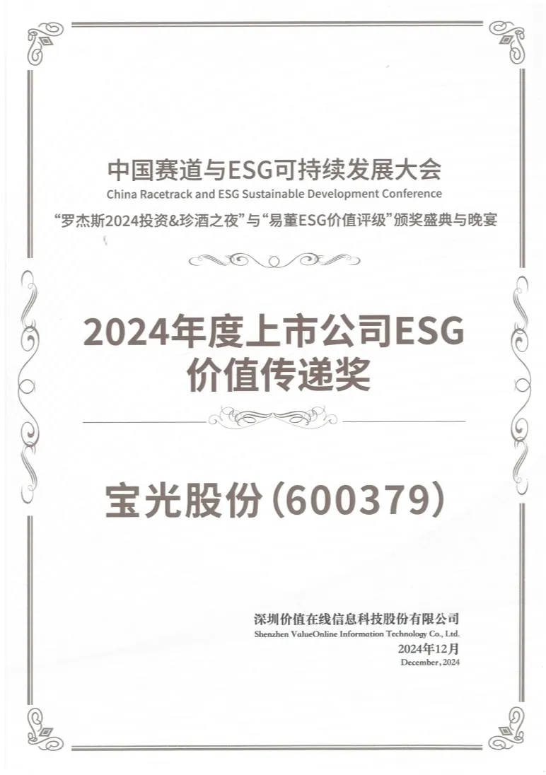 12月8日,易董價(jià)值在線ESG價(jià)值評(píng)級(jí)頒獎(jiǎng)盛典在深圳舉行,寶光股份憑借在ESG方面的突出表現(xiàn),堅(jiān)持透明、負(fù)責(zé)任的ESG實(shí)踐及有效的價(jià)值傳遞,榮獲“2024年度上市公司ESG價(jià)值傳遞獎(jiǎng)”。該獎(jiǎng)項(xiàng)的獲得是對(duì)寶光股份在ESG信息披露、投資者關(guān)系管理和市場(chǎng)溝通等方面的認(rèn)可。