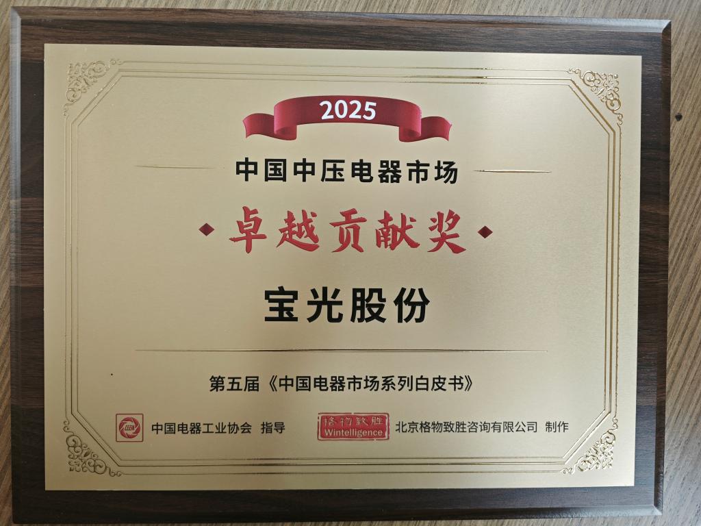 近日,由中國電器工業(yè)協(xié)會指導(dǎo),中電協(xié)理事單位主辦的《2025年中國電器市場系列白皮書》發(fā)布會在上海隆重舉行。會議表彰在市場占有率、增長率和產(chǎn)品創(chuàng)新等方面取得成績的優(yōu)秀電器企業(yè),寶光股份應(yīng)邀參會,榮獲2025年度中國中壓電器市場“卓越貢獻(xiàn)獎”和“銷量領(lǐng)先獎”。