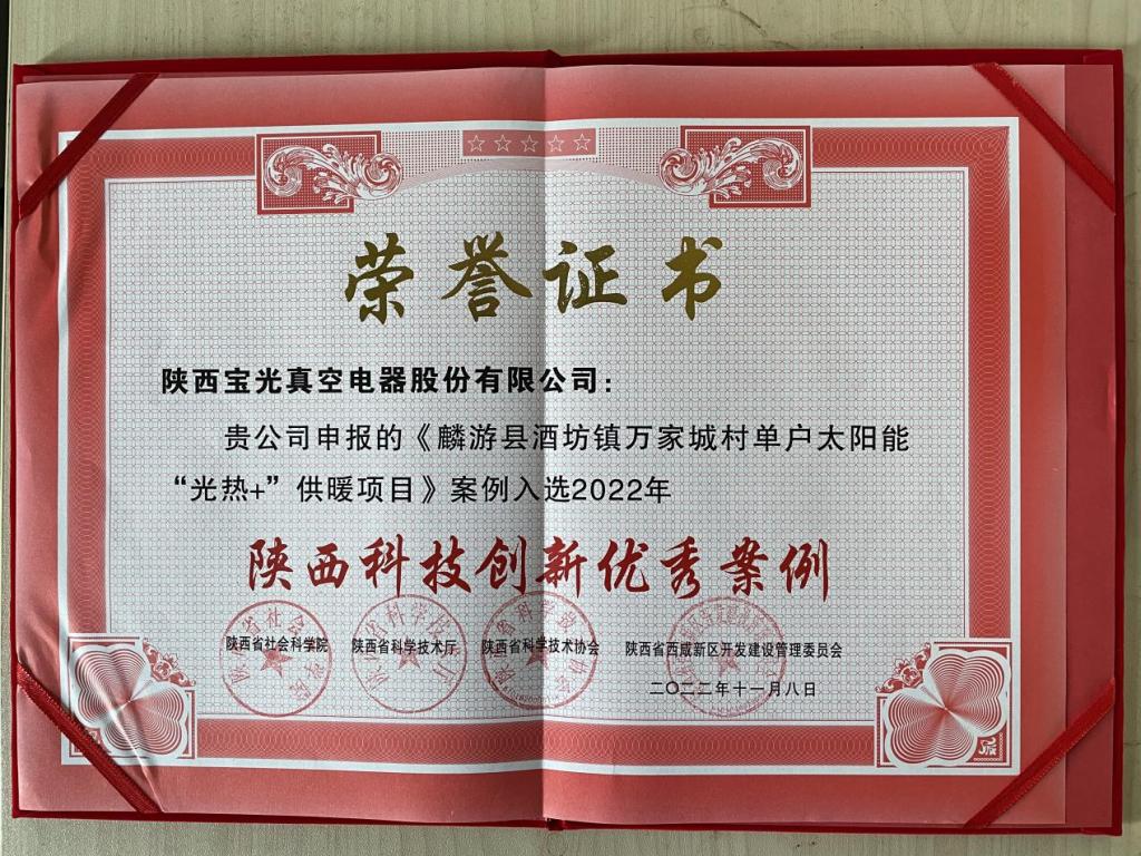寶光股份單戶(hù)太陽(yáng)能“光熱+”供暖項(xiàng)目成功獲選“陜西科技創(chuàng)新優(yōu)秀案例”